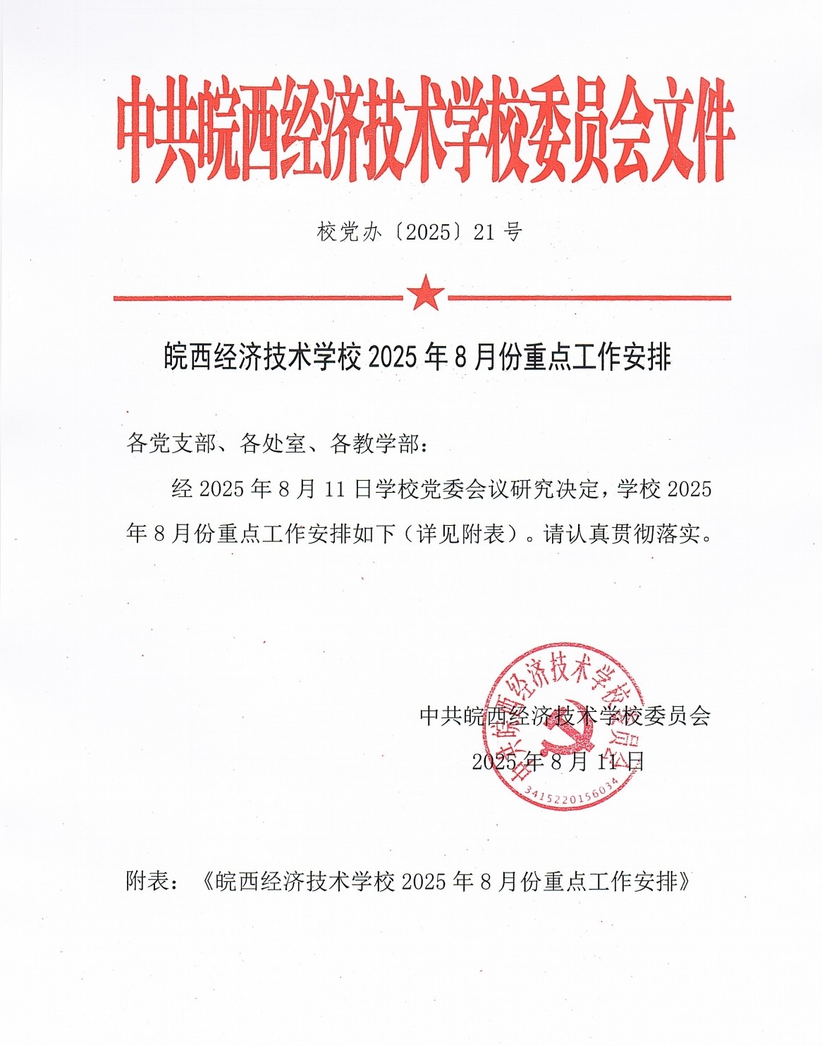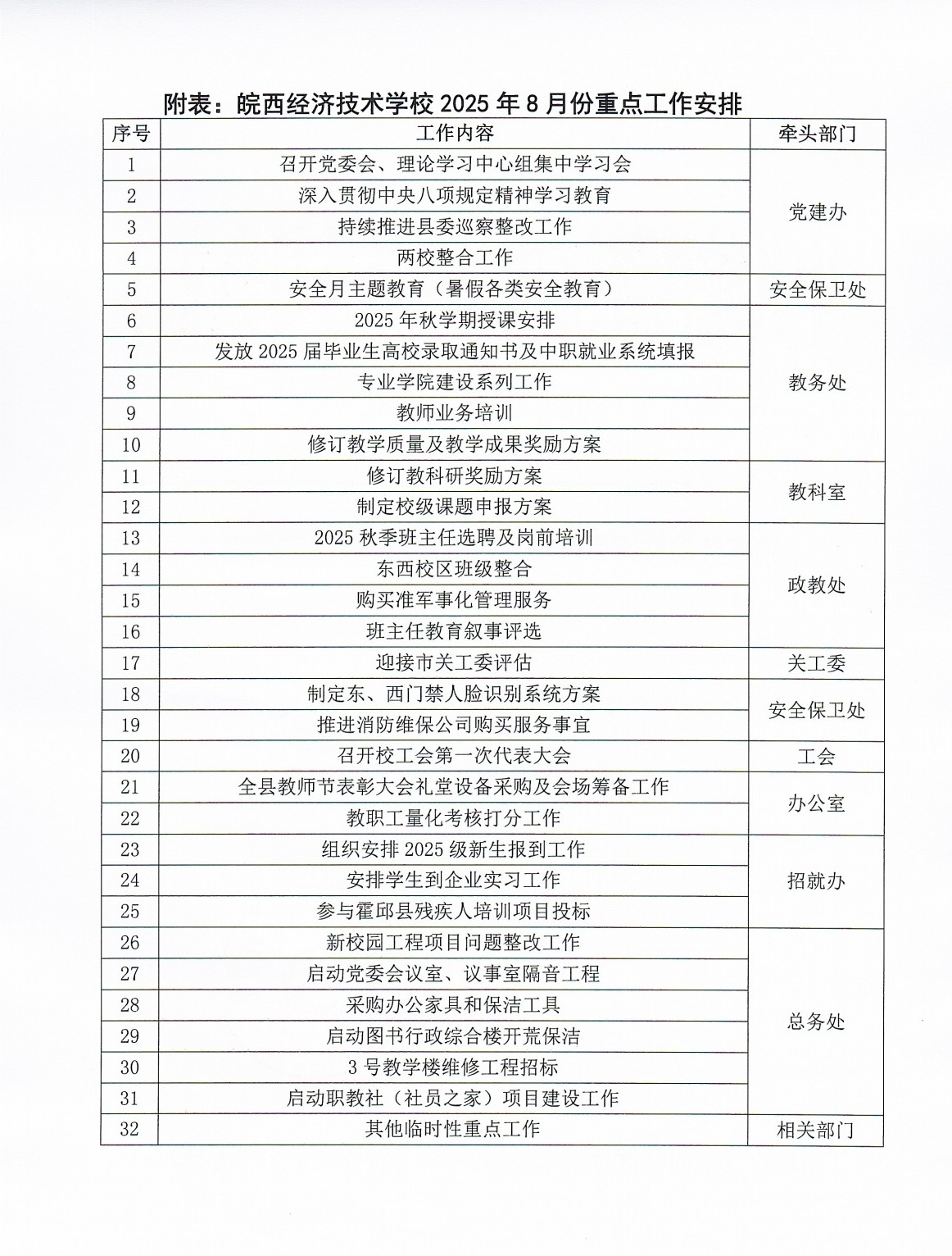 皖西经济技术学校2025年8月份重点工作安排